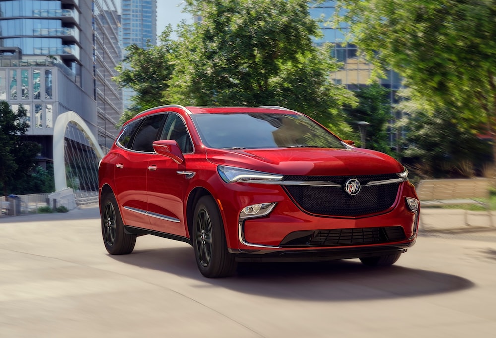 - Buick Enclave: Sleek and modern with chrome finishes and details, the mid-size SUV leans more luxury and offers conveniences like integrated roof rails and a power liftgate.